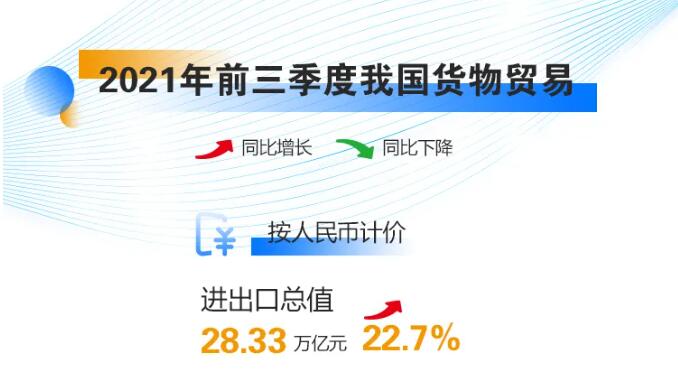 據(jù)海關(guān)統(tǒng)計(jì),前三季度,我國貨物貿(mào)易進(jìn)出口總值28.33萬億元人民幣,比去年同期增長22.7%。