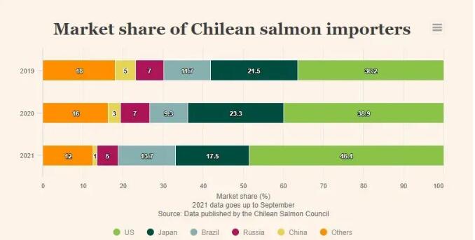 智利產(chǎn)地三文魚也呈現(xiàn)出供應(yīng)減少、價(jià)格上浮的情況。據(jù)智利三文魚協(xié)會(huì)(ChileanSalmonCouncil)統(tǒng)計(jì)數(shù)據(jù)顯示,智利2021年第三季度出口約14萬(wàn)噸養(yǎng)殖鮭鱒魚類,同比下降16%。從智利2021年1-9月的數(shù)據(jù)來(lái)看,美國(guó)、巴西的需求已恢復(fù)至疫情前水平,餐飲渠道需求的恢復(fù)和開發(fā)推動(dòng)了智利三文魚對(duì)美國(guó)市場(chǎng)的出口量增加,并將價(jià)格維持在較高水平。而中國(guó)市場(chǎng)則尚未恢復(fù),從2020年中期開始,市場(chǎng)需求一路下滑,雖然2021年第三季度同比增長(zhǎng)20%,但仍低于疫情前的水平。