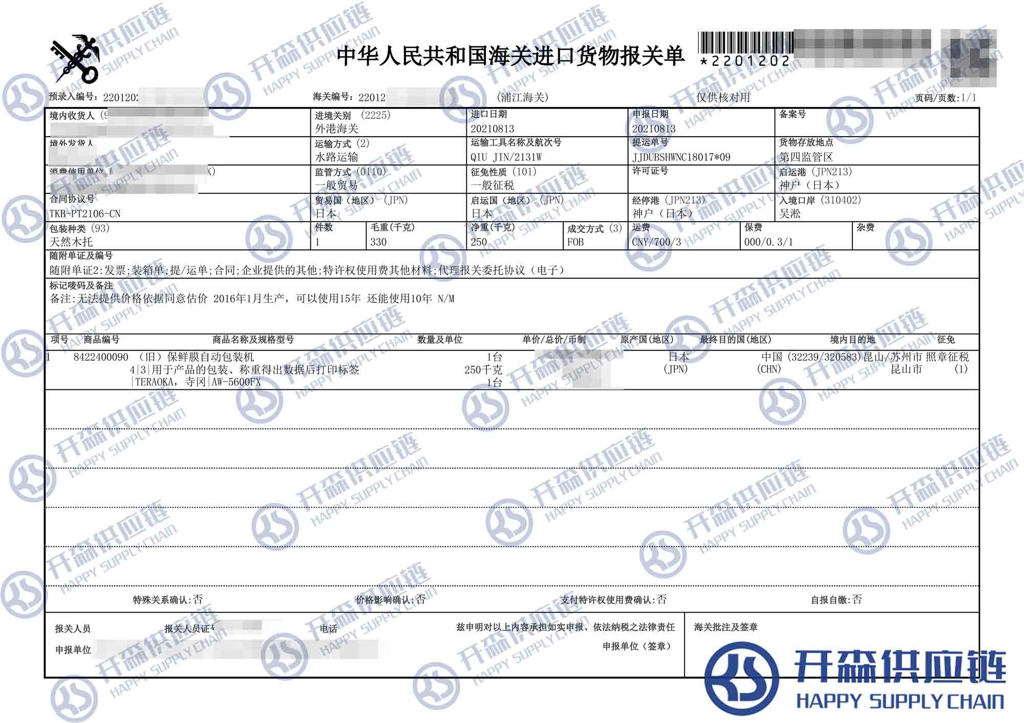 一、舊保鮮膜自動(dòng)包裝機(jī)進(jìn)口報(bào)關(guān)代理案例詳情