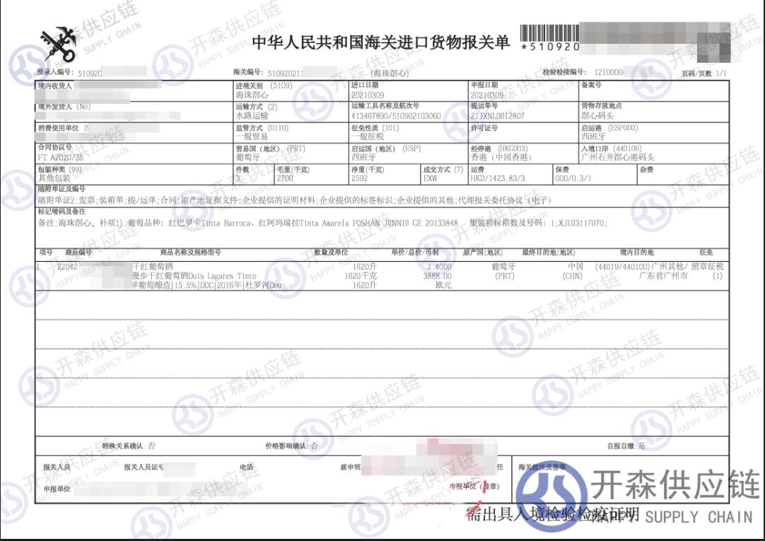 【本文結語】 上述就是【進口案例】葡萄牙葡萄酒進口報關代理服務的全部內容,希望能對您有所幫助,如有葡萄酒進口報關上任何疑問及問題可隨時在線聯系我們或撥打 18002611553,開森供應鏈擁有豐富的葡萄酒進口報關操作經驗及案例,10余年進口經驗為您所用,各類進口疑難都能為您一一解答及協助快速處理解決!